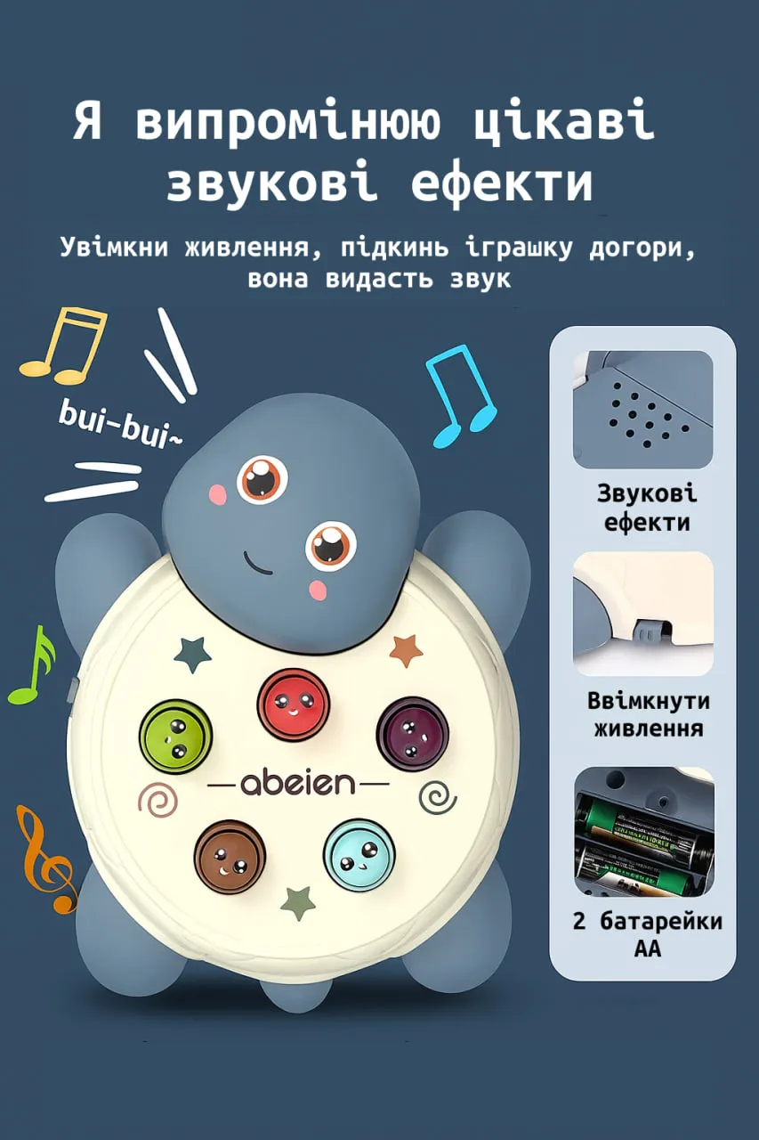 Стильна синя черепашка — універсальний варіант для активних малюків! Дитина із задоволенням буде стукати по кольорових клавішах, слухати мелодії й вивчати перші фрази англійською. Чудовий вибір для розвитку та веселого дозвілля.